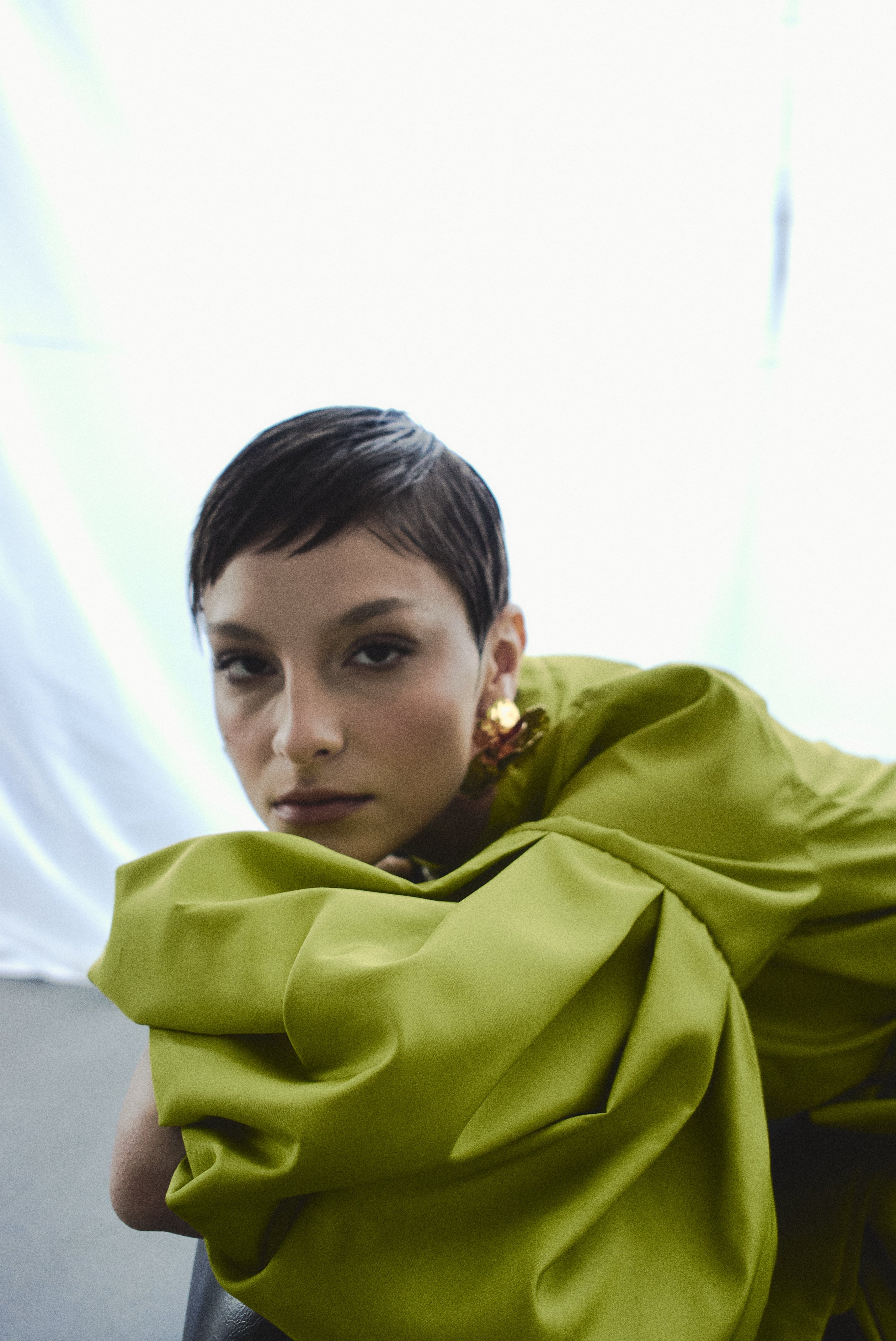 Pile Kol Detaylı Tafta Elbise Fıstık Yeşili