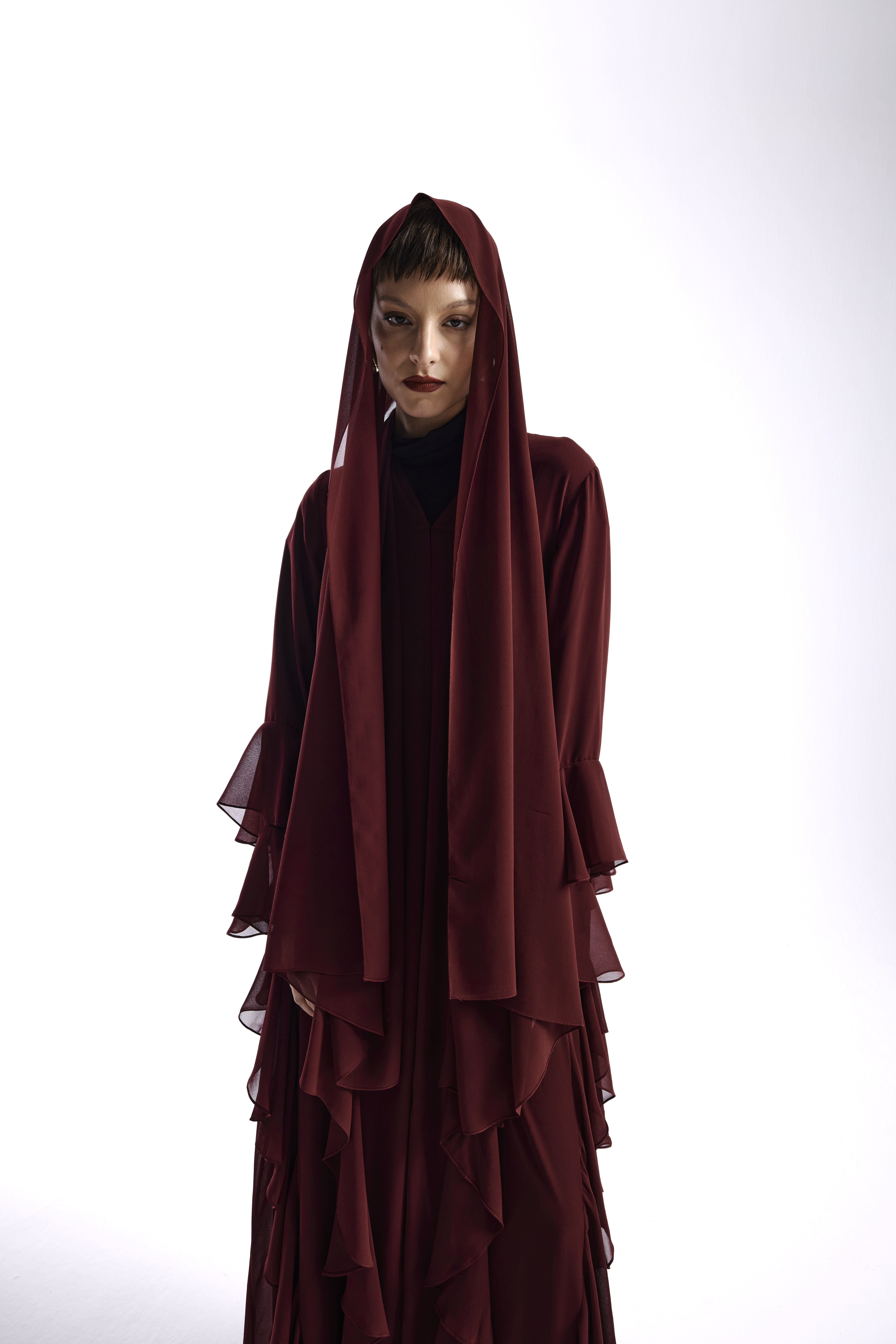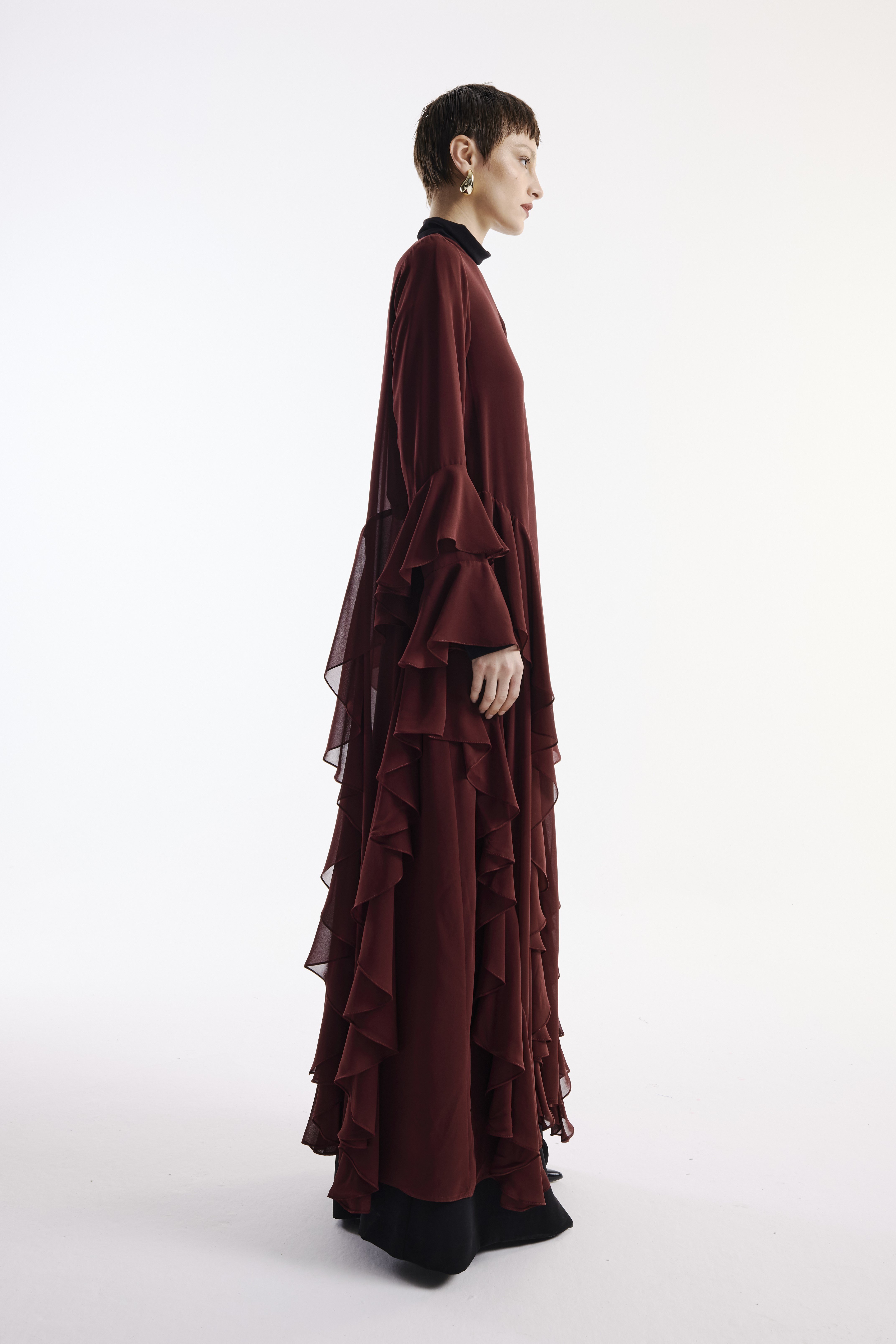 Şifon Abaya Volan Detaylı Bordo+ Şal
