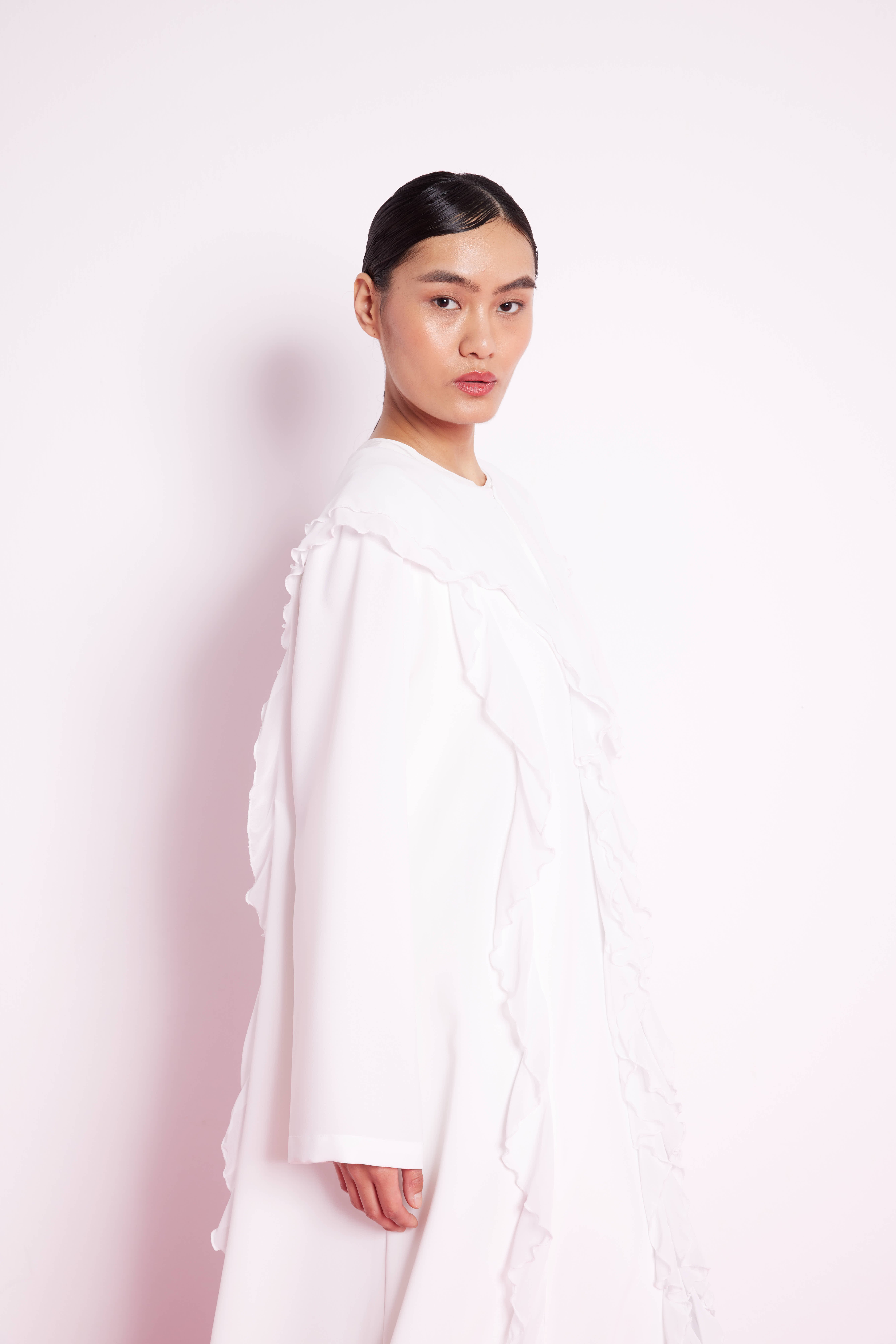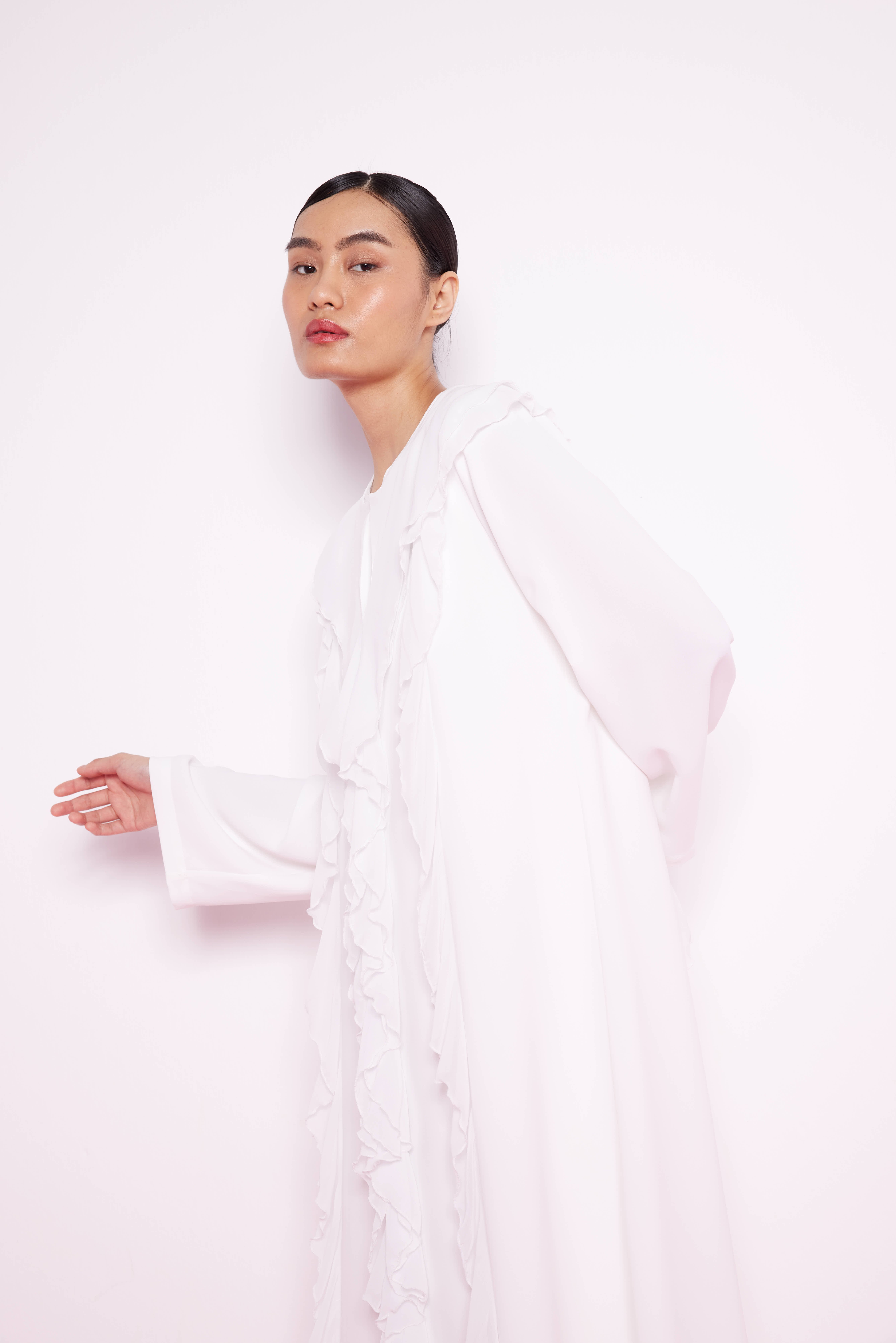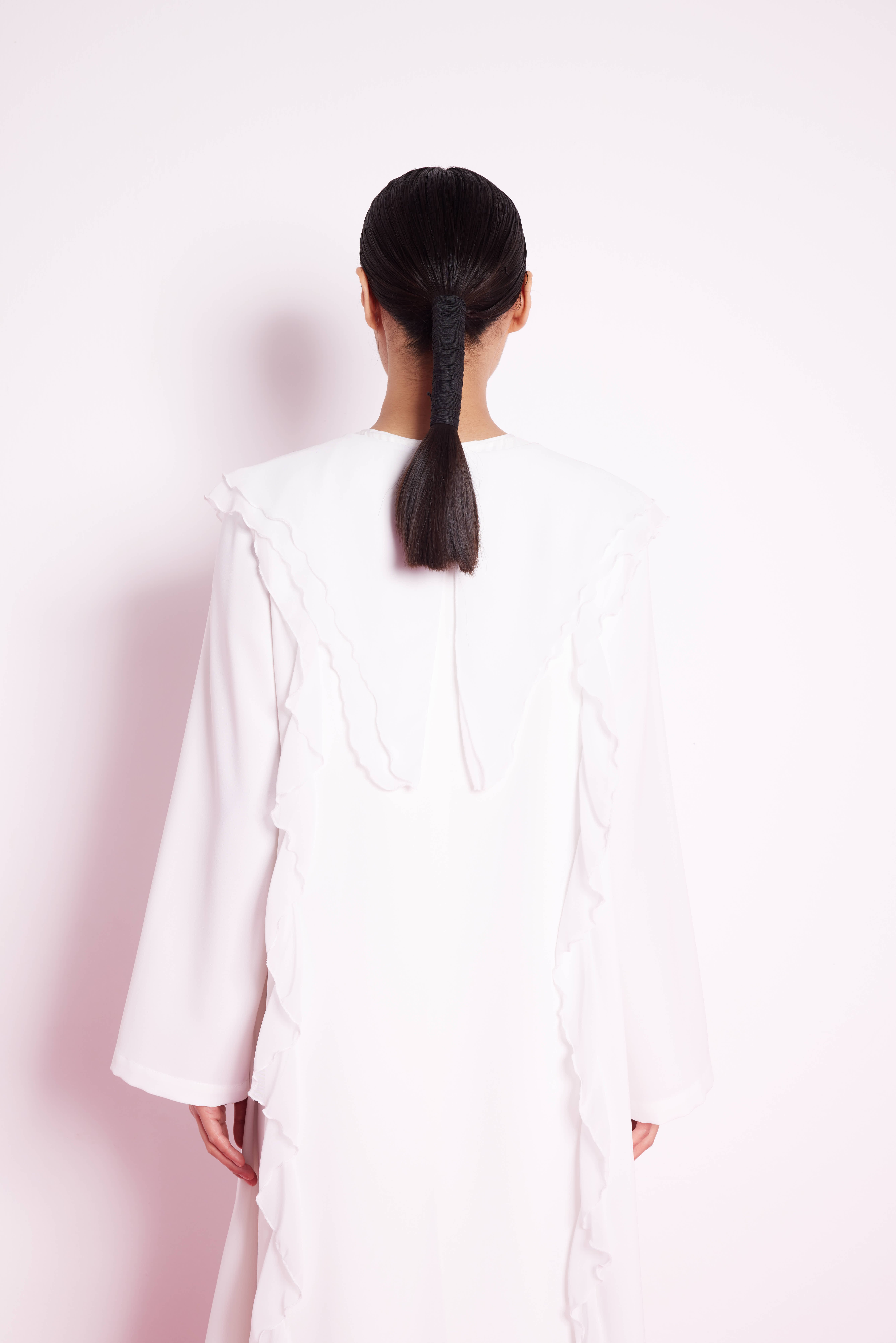 Volan Şeritli Abaya Beyaz
