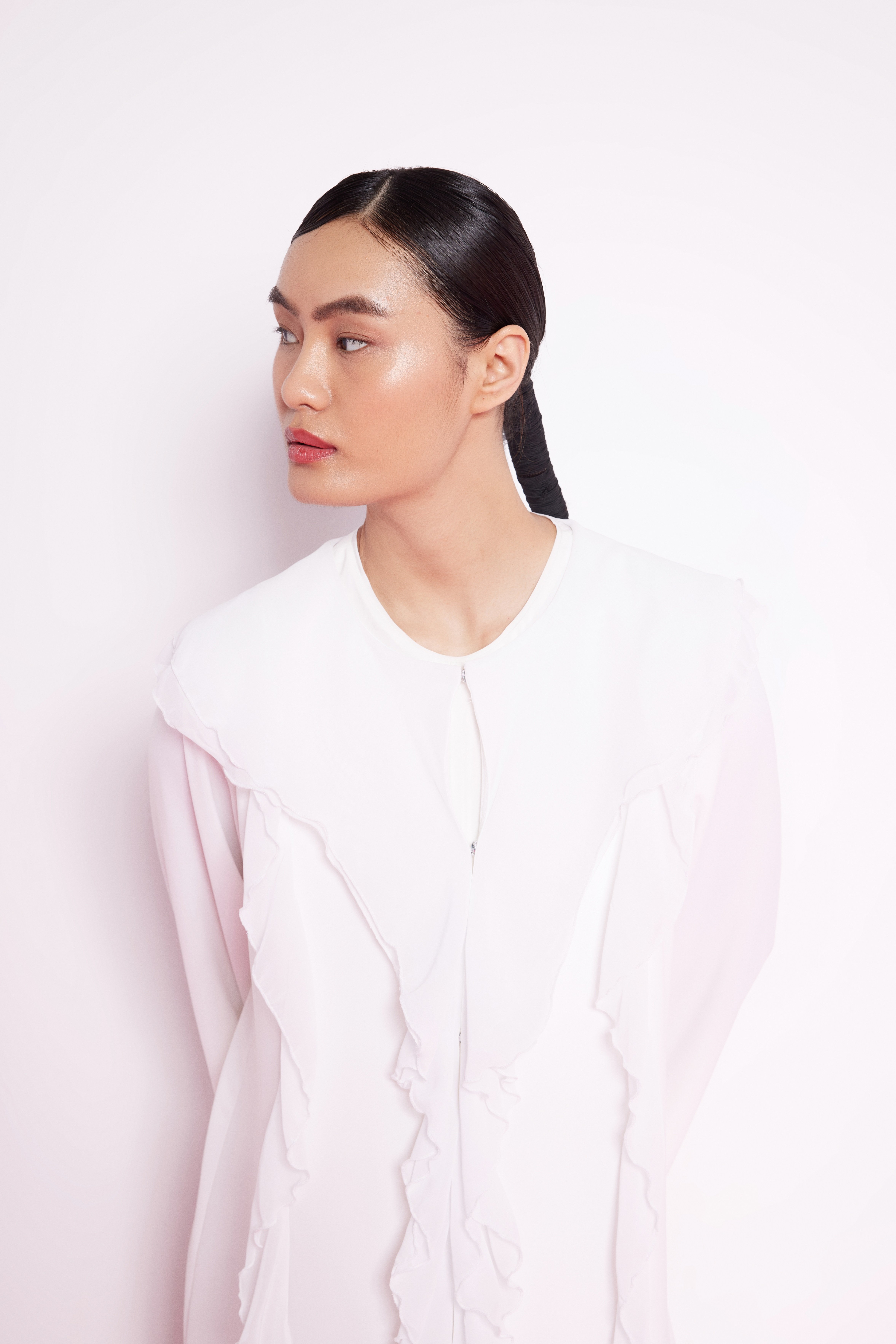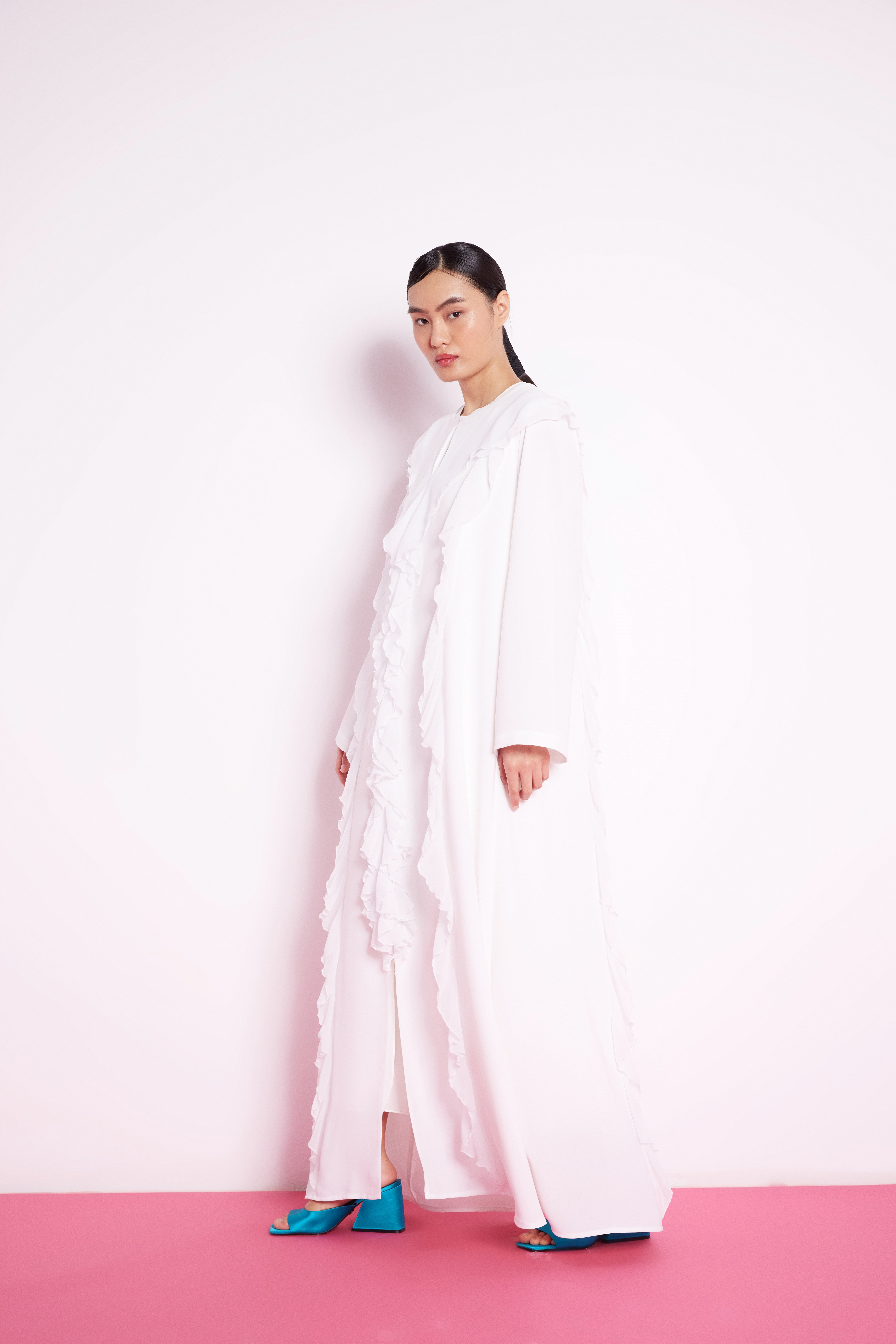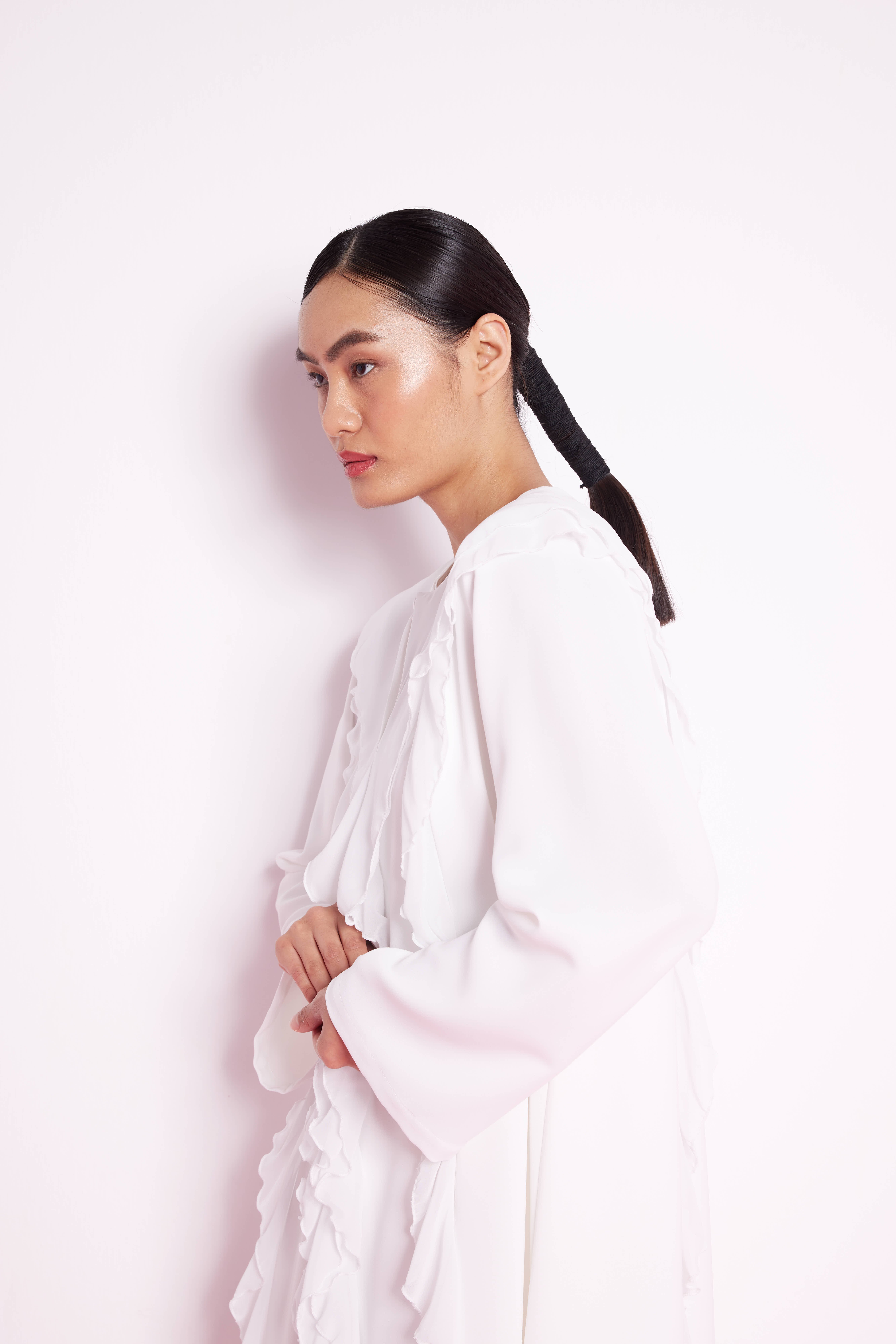 Volan Şeritli Abaya Beyaz